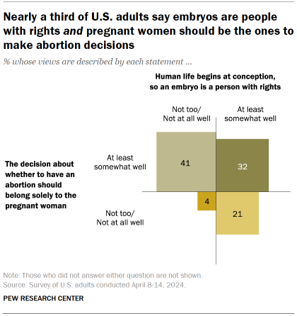 About a third of Americans (35%) say the statement “human life begins at conception, so an embryo is a person with rights” describes their views extremely or very well, while 45% say it does not describe their views well.