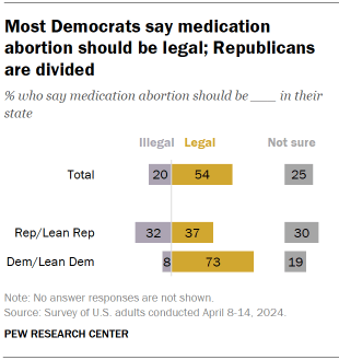 - Democrats (73%) overwhelmingly say medication abortion should be legal. Just 8% say it should be illegal, while 19% are not sure.