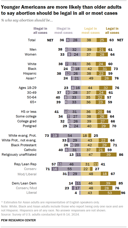 Today, roughly six-in-ten (63%) say abortion should be legal in all (25%) or most (38%) cases. And 36% say it should be illegal in all (8%) or most (28%) cases.