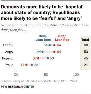 Americans continue to be more likely to feel fearful and angry about the state of the nation than to feel hopeful or proud – and this has largely been the case since Pew Research Center first asked these questions in June 2020.