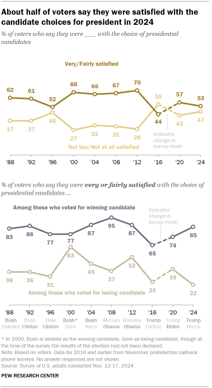 About half of voters (53%) say they were very or fairly satisfied with the choice of presidential candidates this year, while 47% say they were not too or not at all satisfied with the choice of presidential candidates.