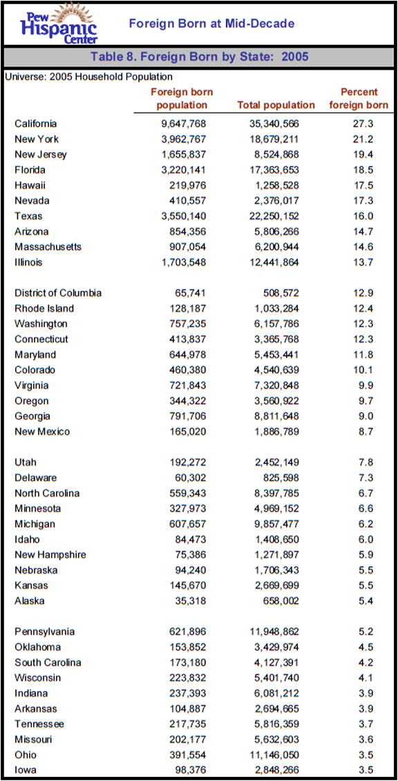 Table 8. Foreign Born by State: 2005