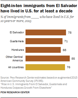 Among immigrants in 2015, 78% from El Salvador, 71% from Guatemala and 68% from Honduras had lived in the U.S. for 10 years or more. Immigrants from other Central American nations are even more likely to be longer-term U.S. residents: 85% have lived in the U.S. for at least a decade as of 2015. Among all U.S. immigrants in 2015, 76% lived in the U.S. for 10 years or more. The share of immigrants in the U.S. for 10 years or more has risen for all these groups since 2007.