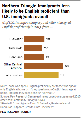 In 2015, half of U.S. immigrants ages 5 and older (51%) were proficient in English, compared with almost a third of those from the Northern Triangle.