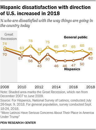 Six-in-ten Hispanics (62%) say they are dissatisfied with the way things are going in the country today, up from 50% in 2017. Hispanic dissatisfaction is the highest since 2008 during the Great Recession, when 70% were dissatisfied with the direction of the country.