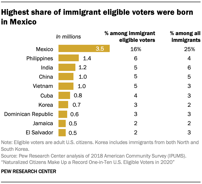 The representation of countries of birth among immigrant eligible voters is different than that among U.S. immigrants overall. For example, immigrant eligible voters born in Mexico account for 16% of all foreign-born eligible voters, far below their 25% share among all immigrants living in the U.S. By contrast, immigrant Filipino eligible voters make up 6% of foreign-born eligible voters but make up 4% of all U.S. immigrants. These gaps in representation among these immigrant populations reflect differences in naturalization rates.