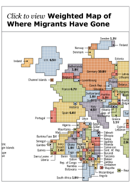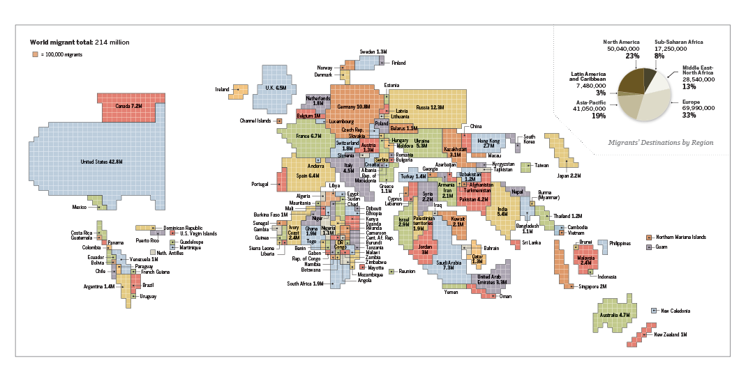 While migrants come from a very diverse and widespread array of countries, the vast majority end up immigrating to a relatively few areas – North America, Europe, Australia and the Arab states of the Persian Gulf, as shown on the Destinations cartogram.