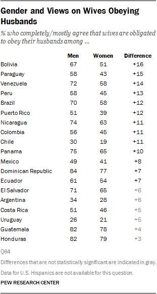 Younger adults (ages 18-34) are less likely than their elders to say that a wife is obligated to obey her husband. And overall, more Latin American men than women say that wives are obligated to obey their husbands.