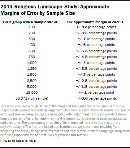 Generally speaking, larger sample sizes are associated with smaller margins of sampling error, and smaller sample sizes are associated with larger margins of error. The margin of error for national estimates from this survey is +/- 0.6 percentage points. The margins of error for subgroups are larger. The accompanying tables present sample sizes and corresponding margins of error for the religious traditions discussed throughout much of this report, as well as for each state and the MSAs analyzed here and online. Sample sizes and margins of error for other groups are available upon request.