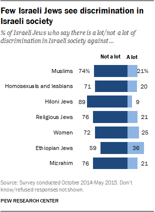 Most Israeli Jews do not see evidence of widespread discrimination against a number of groups in their society. For example, 21% of Israeli Jews say that in their society there is a lot of discrimination against Muslims, while about three-quarters (74%) say there is not a lot of discrimination against Muslims in Israel.