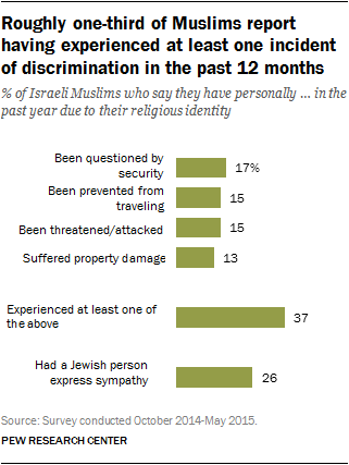 The survey also asked about personal experiences with discrimination. About one-in-six Muslims say they have been questioned by security officials (17%), prevented from traveling (15%) or physically threatened or attacked (15%) because of their religion in the past 12 months, while 13% say they have suffered property damage. All told, 37% of Muslims say they have suffered at least one of these forms of discrimination because of their religious identity in the past year.8