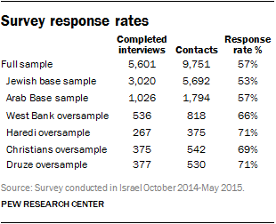 Between Oct. 14, 2014, and May 21, 2015, Pew Research Center completed 5,601 face-to-face interviews with non-institutionalized adults ages 18 and older living in Israel. The sample includes interviews with 3,789 Jews, 871 Muslims, 468 Christians and 439 Druze. An additional 34 respondents belong to other religions or are religiously unaffiliated. Five groups were oversampled as part of the survey design: Jews living in the West Bank, Haredim, Christian Arabs, Arabs living in East Jerusalem and Druze.