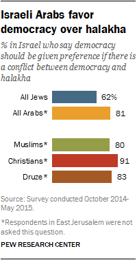 Large majorities of Muslims, Christians and Druze in Israel say the state should give priority to democracy over Jewish law.