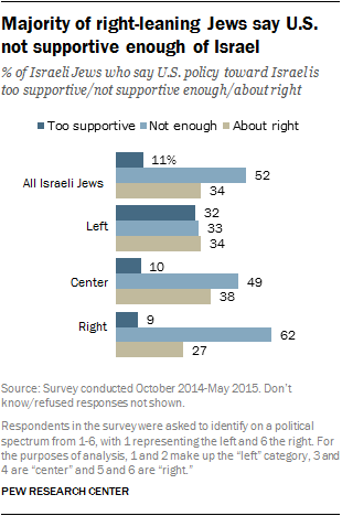 As on views of the peace process and settlements, Israeli Jews’ opinions on U.S. support for Israel are strongly tied to their self-described political ideology. Those on the right (62%) are considerably more likely than those on the left (33%) or in the center (49%) to say the U.S. is not supportive enough of Israel.