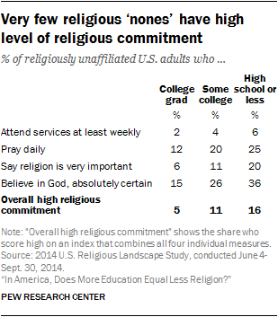 While college-educated Christians are about as observant – and sometimes more observant –than Christians with less education, the data show that among the religiously unaffiliated (i.e., those who describe their religious identity as atheist, agnostic or “nothing in particular”), those who have college degrees are considerably less religious than “nones” without a college education.