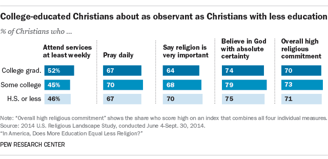 Overall, 70% of Christians with college degrees have a high level of religious commitment on a scale incorporating four common measures of religious observance (worship attendance, frequency of prayer, belief in God and the self-described importance of religion in one’s life), as do 73% of those with some college and 71% of those with no college experience. 3