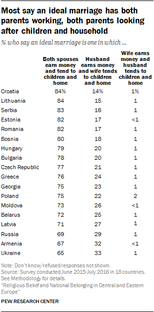Clear majorities in all countries surveyed favor a marriage in which both spouses work and share household responsibilities. Preference for this type of marriage ranges from a low of 65% in Ukraine to a high of eight-in-ten or more in Croatia, Lithuania and several other countries.