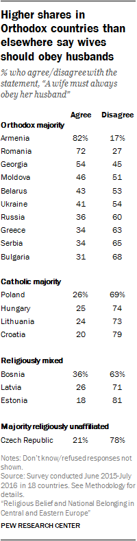 In countries without an Orthodox majority, this position is less accepted. In Estonia, for example, just 18% accept this view. And in all four of the Catholic-majority countries surveyed (Croatia, Hungary, Lithuania and Poland), large majorities oppose the idea that a wife must always obey her husband.
