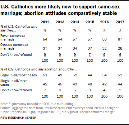 Pew Research CenterFebruary 28, 2018 Pope Francis Still Highly Regarded in U.S., but Signs of Disenchantment EmergeU.S. Catholics more likely now to support same-sex marriage; abortion attitudes comparatively stable