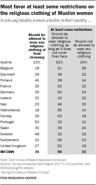 A hotly debated question in some parts of Europe is whether Muslim women should be prohibited from wearing various kinds of religious clothing. Respondents were asked which of three options they favor: “Muslim women who live in [country] should be allowed to wear any religious clothing of their choosing,” “Muslim women who live in [country] should be allowed to wear religious clothing, as long as it does not cover their face,” or “Muslim women who live in [country] should not be allowed to wear any religious clothing.”