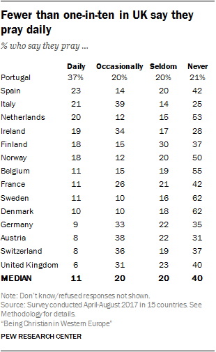 A median of just one-in-ten people (11%) across the 15 Western European countries surveyed say they pray daily, while nearly four times as many – a median of 40% – say they never pray. In several countries, at least half of adults say they never pray, including majorities in Sweden and Denmark (62% each).