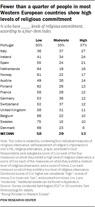 On this index, Portugal is the most religiously observant country in Western Europe, with more than a third of Portuguese adults (37%) showing high levels of religious commitment. Some other predominantly Catholic countries, including Italy (27%), Ireland (24%) and Spain (21%), also have relatively large shares of highly observant people. At the other end of the spectrum, just 8% of adults in predominantly Protestant Denmark are highly religious, and three-quarters of Swedes show low levels of religious commitment.