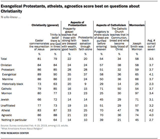 In addition to the questions about the Bible, the survey contained seven items about elements of Christianity. On average, U.S. adults correctly answer half (3.5) of these questions. Evangelical Protestants get 4.1 of the seven right, on average, on par with atheists (4.2) and agnostics (4.1). Catholics (3.7 questions right, on average) and mainline Protestants (3.7) are next, followed by Mormons (3.4) and Jews (3.1).