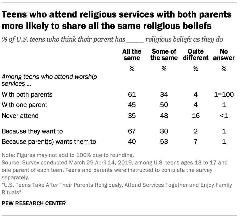 Why teens attend worship services appears to be similarly important. Among teens who say they attend services mainly because they want to, two-thirds also report that their religious beliefs are all the same as their parent’s beliefs. By contrast, among those who say they attend because their parents want them to, just four-in-ten say they hold all the same religious beliefs their parent holds.