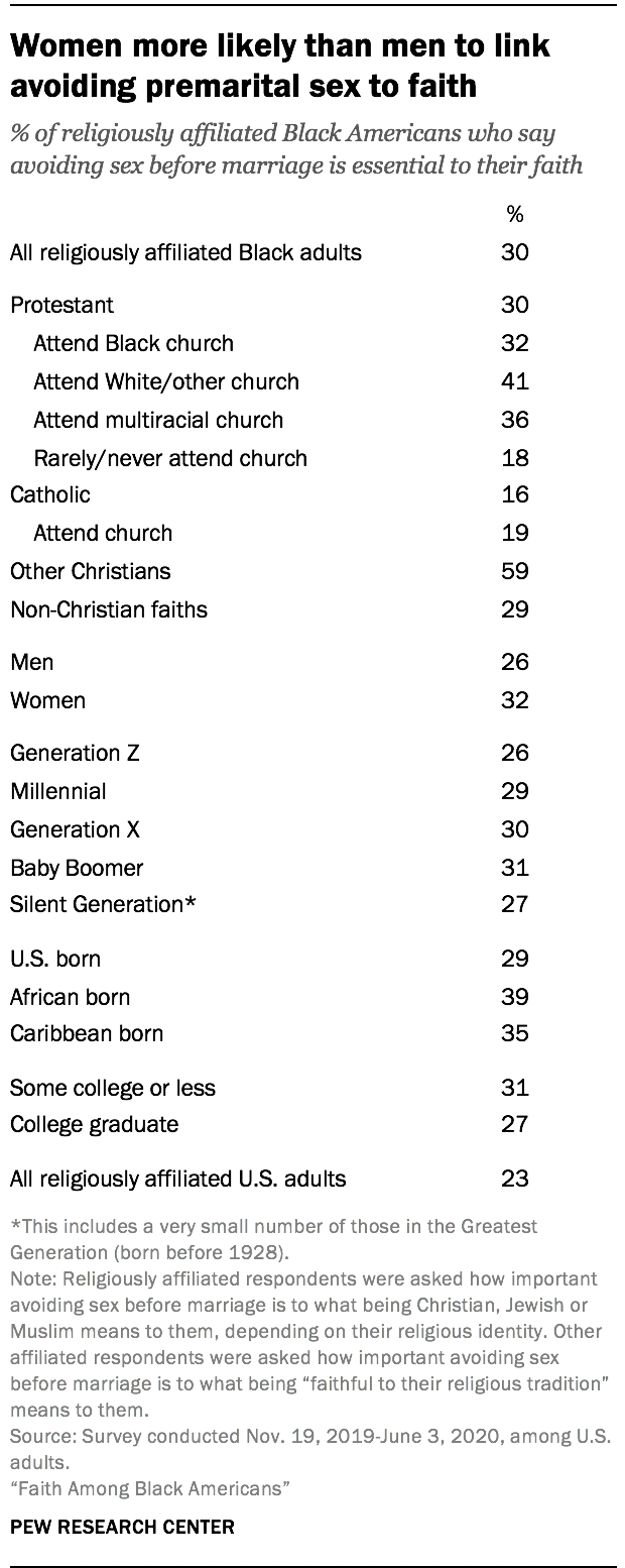Religiously affiliated Black adults who attend religious services at least weekly (46%) are more likely to say avoiding premarital sex is essential to their faith than those who attend once or twice a month or a few times a year (21%) or seldom or never (16%). And religiously affiliated Black women and African immigrants are more likely to say this than Black men and U.S.-born adults.