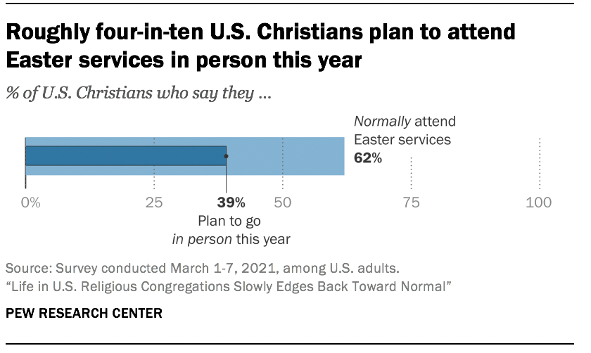 But while in-person religious attendance has begun to rebound, it still is far from normal. Most people who say they generally attend religious services at least once or twice a month (58%) say they have not attended during the past month. And just four-in-ten U.S. Christians (39%) plan to go in person to church services this Easter Sunday, which is sharply lower than the 62% who say they typically go to church on Easter.