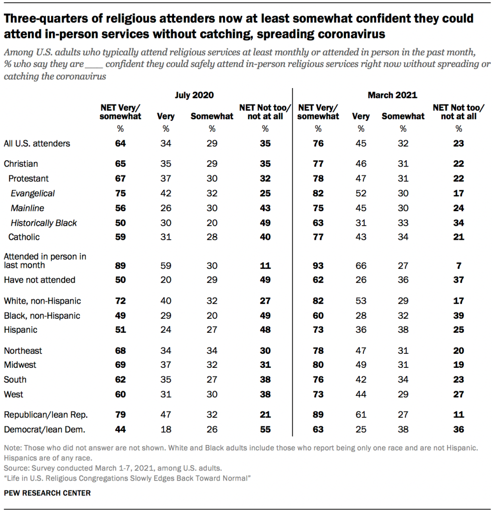 Three-quarters of U.S. adults who typically attend religious services (or attended in person in the last month) say they are at least somewhat confident they now could attend services at their congregation safely without catching or spreading the virus, including 45% who are “very” confident and an additional 32% who are “somewhat” confident. This constitutes a significant change since July 2020, when fewer (64%) expressed at least some confidence, including one-third (34%) who were “very” confident they could attend religious services safely.