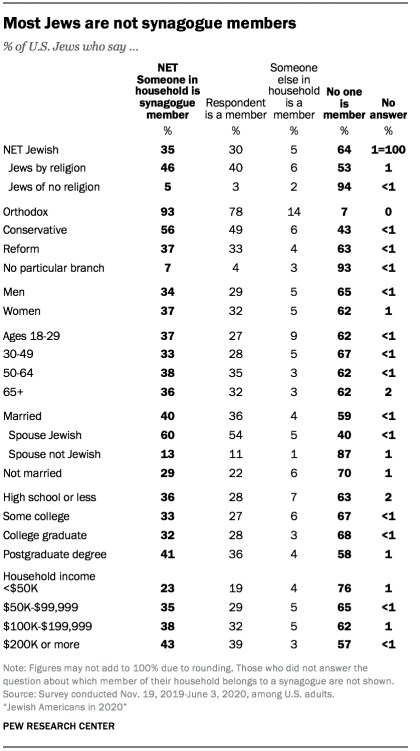 About one-third of U.S. Jews (35%) say they live in a household where someone is a formal member of a synagogue. This includes 46% of Jews by religion, compared with 5% of Jews of no religion.