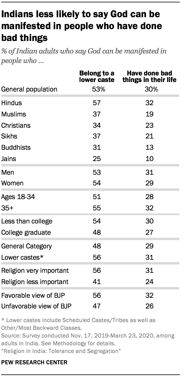 Hindus are more likely than members of other religious groups to say that God can manifest in lower-caste people and in people who have done bad things, in part because Hindus are more inclined than people from other religious communities to say God can be manifested in people at all.