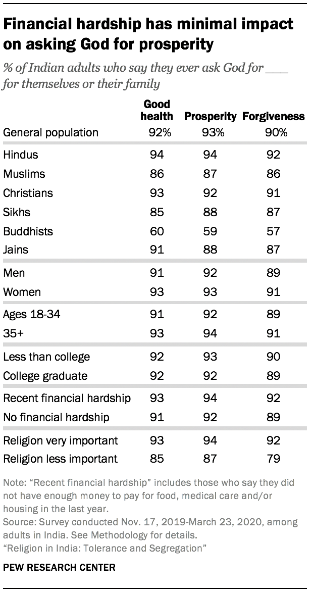The vast majority of Indians who have faced financial difficulties in the past year say they ask God for prosperity (94%) as well as good health (93%) and forgiveness (92%). But Indians who recently faced financial hardship are only slightly more likely than other Indians to ask God for each of these things, including prosperity (94% and 92%, respectively).