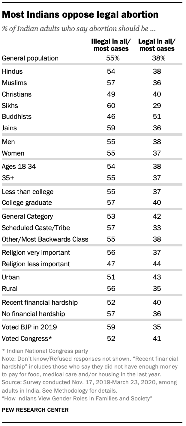 Despite this, the survey finds that most Indian adults do not believe abortion should generally be legal. Indeed, a slim majority (55%) say abortion should be illegal in all or most cases, including 36% who say it should be illegal in allcases. Just 38% of Indians say it should be legal in all or most cases.