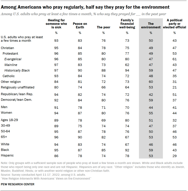 Among Americans who pray at least monthly, half say they have prayed for the environment in the past year (50%) – lower than all other items except praying for a political party or elected official (43%). While there is little variation across Christian traditions in the share who pray for the environment, members of other (non-Christian) faiths are somewhat more likely than Christians to do this, and Democrats who pray regularly are more likely than their Republican counterparts to say they include the environment in their prayers (59% vs. 42%).
