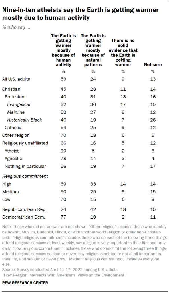 Nine-in-ten atheists say the Earth is getting warmer mostly due to human activity, as do 78% of agnostics. Evangelical Protestants are the least likely to express this view (32%).