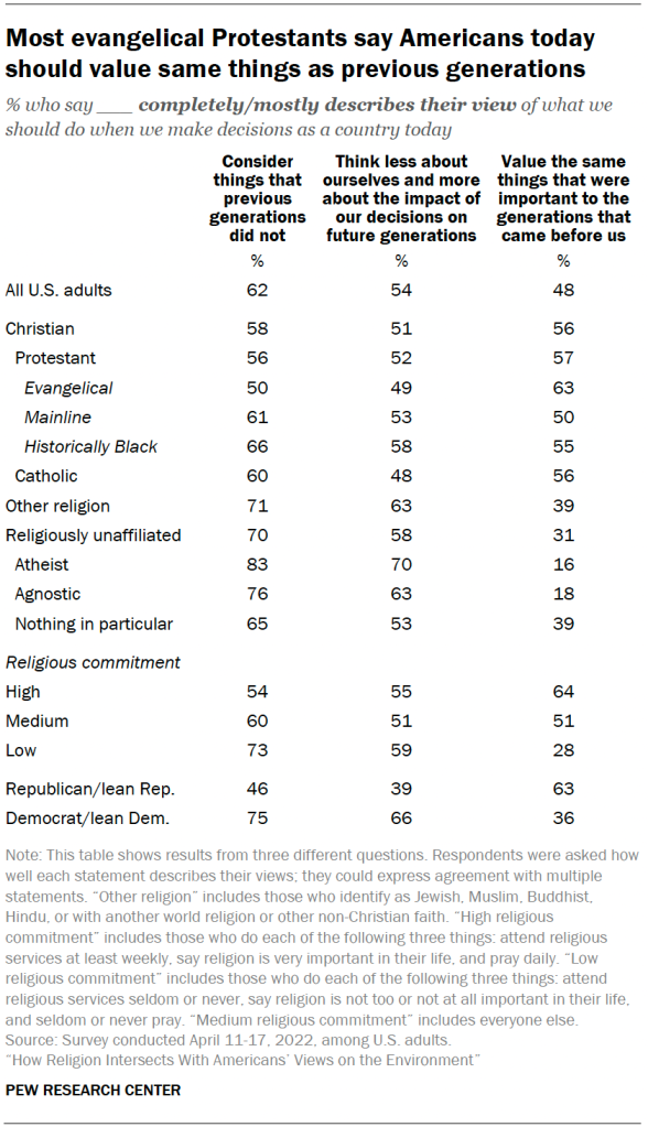 Another possible reason evangelical Protestants stand out in their views on the climate is that they are the most likely of the major U.S. religious groups to say that when Americans make decisions as a country, we should value the same things that were important to generations that came before us (63%). By contrast, majorities of other groups agree with the notion that we should consider things that previous generations did not think about; half of evangelicals say the same.