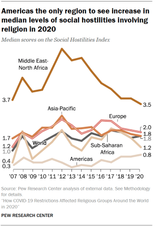In the Americas, the median score ticked up from 0.7 to 0.8 but remained the lowest of any region. While most countries in the Americas had “low” or “moderate” levels of social hostilities, Mexico and Brazil fell into the “high” category. In Mexico, two evangelical Protestant pastors were killed in 2020, and there were reports that others were attacked or abducted. Nongovernmental organizations said that religious leaders were “singled out” by criminal groups for denouncing illegal activities and to instill fear so these activities could continue.
