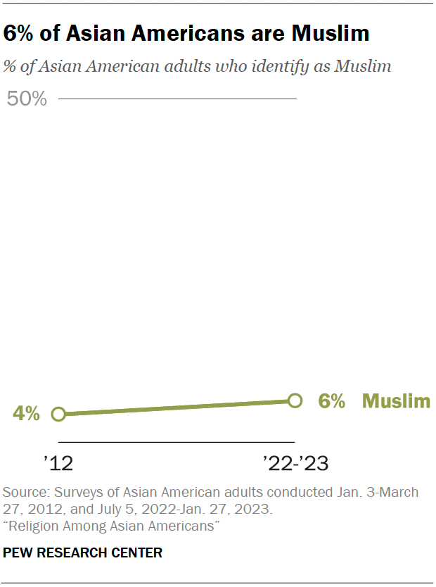 About 6% of Asian Americans now say their religion is Islam. An additional 3% say they feel close to Islam for reasons such as family background or culture, rather than religion.10