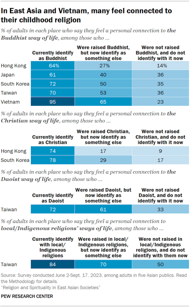 More broadly, over half of all adults in South Korea (70%), Taiwan (67%) and Japan (55%) say they feel connected to at least one tradition besides their own, compared with smaller shares in Hong Kong (39%) and Vietnam (31%) who express similar connections.