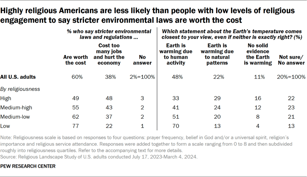 The survey also shows that Americans who are very religious are less likely than those with low and medium-low levels of religious commitment to view stricter environmental regulations as worth the cost, and to say that the Earth is getting warmer mostly because of human activity.