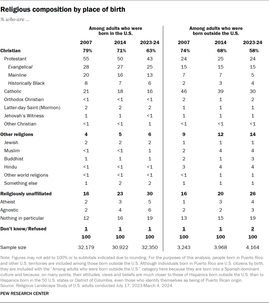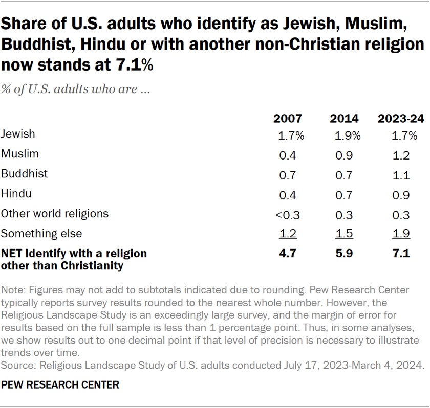 The share of Americans who identify with religions other than Christianity has increased – albeit from a small base – from 4.7% of U.S. adults in the 2007 RLS to 7.1% in the 2023-24 RLS.33