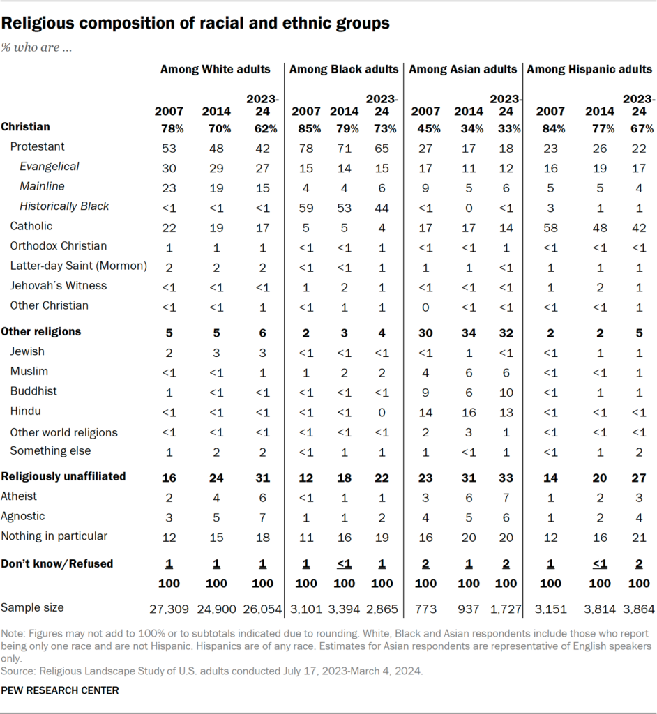 In addition, people of every racial and ethnic background that we measure are less likely to say they are Christian now than they were in 2007, as are people in every major region of the U.S.