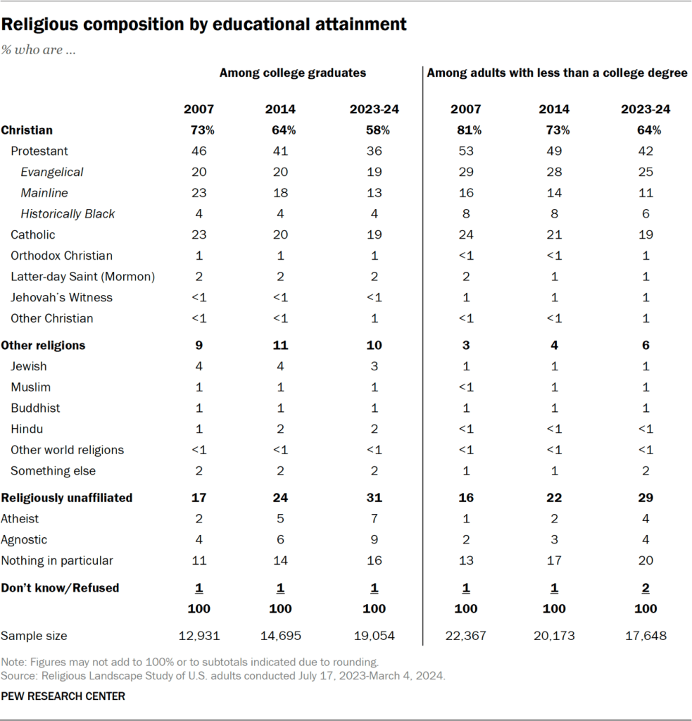 While the percentage of “nones” varies across social and demographic groups, the direction of the trend from 2007 to 2023-24 is the same across the board: It is up, at least marginally, in every category.