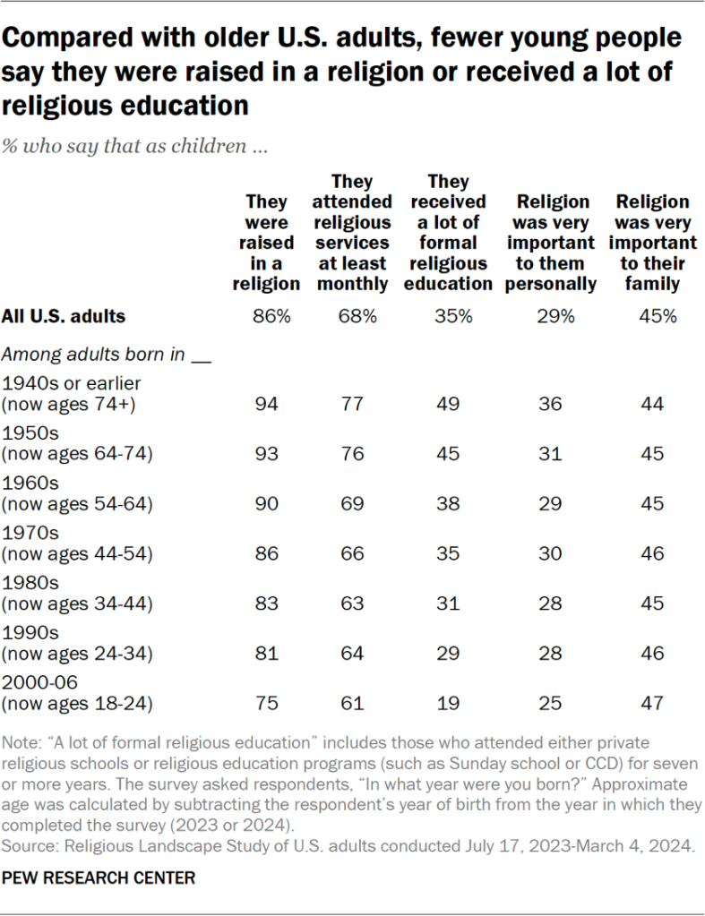 Older adults are generally more likely than younger adults to have been raised with religion in their lives, according to several measures in the survey. For example, 94% of people born before 1950 say they were raised in a religion, compared with 81% of those born from 1990 to 1999, and 75% of adults born between 2000 and 2006.