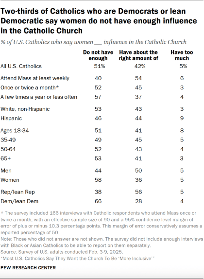 Looking at partisan breakdowns, two-thirds of Catholic Democrats say that women do not have enough influence in the church, compared with 38% of Republican Catholics.