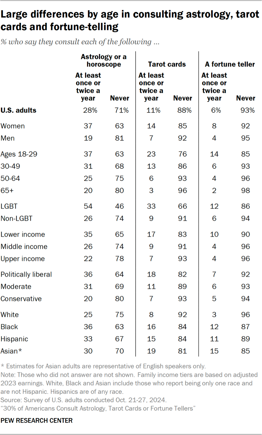 A fall 2024 Pew Research Center survey finds that 30% of U.S. adults say they consult astrology (or a horoscope), tarot cards or a fortune teller at least once a year, but most do so just for fun, and few Americans say they make major decisions based on what they learn along the way.