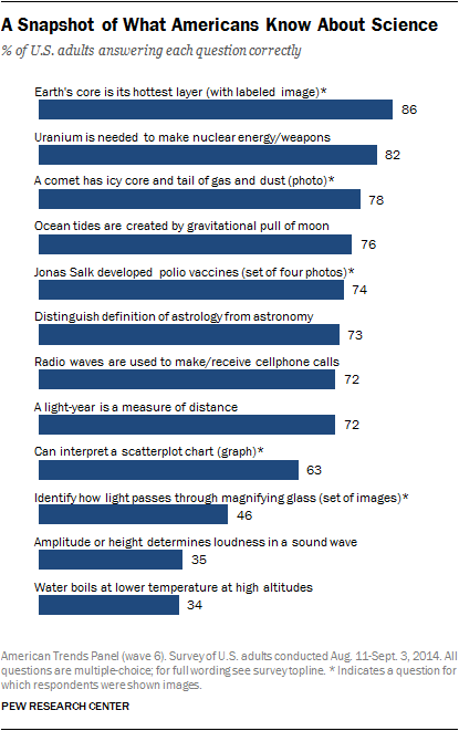 But far fewer are able to identify the property of a sound wave that determines loudness. Just 35% correctly answer amplitude, or height. Some 33% incorrectly say it is frequency and 23% say it is wavelength. And just 34% correctly state that water boils at a lower temperature in a high-altitude setting (Denver) than near sea level (Los Angeles).