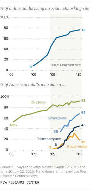 More than two-thirds of Americans owned a smartphone by 2015, six times the ownership levels at the dawn of Obama’s tenure. When Apple released the iPad halfway through Obama’s first term, a mere 3% of Americans owned tablets; nearly half had tablets by the end of 2015.